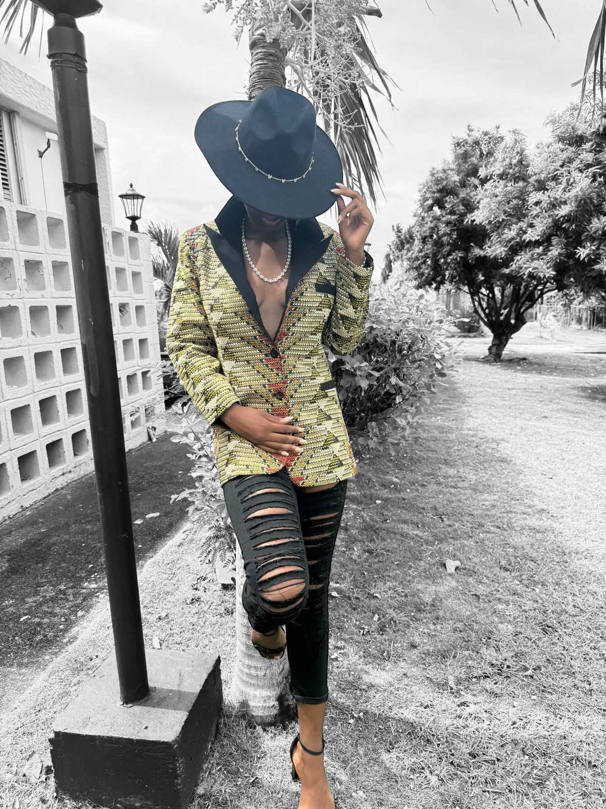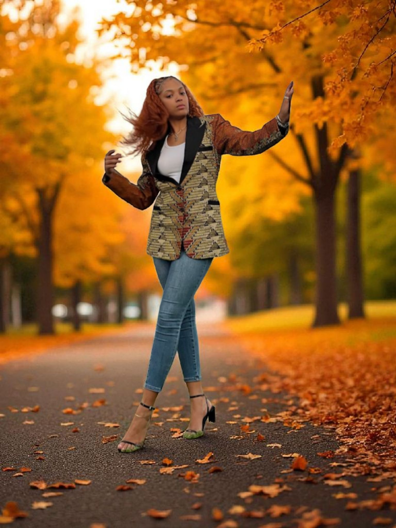 "Elevate your outerwear with this elegant bronze blazer. The rich bronze hue and intricate pyramid print create a luxurious and eye-catching look. Its versatile design makes it easy to layer over both casual and formal outfits, ensuring you're stylishly prepared for Fall/Winter season."Pair it with jeans, Slacks or a dress to inhalant your look